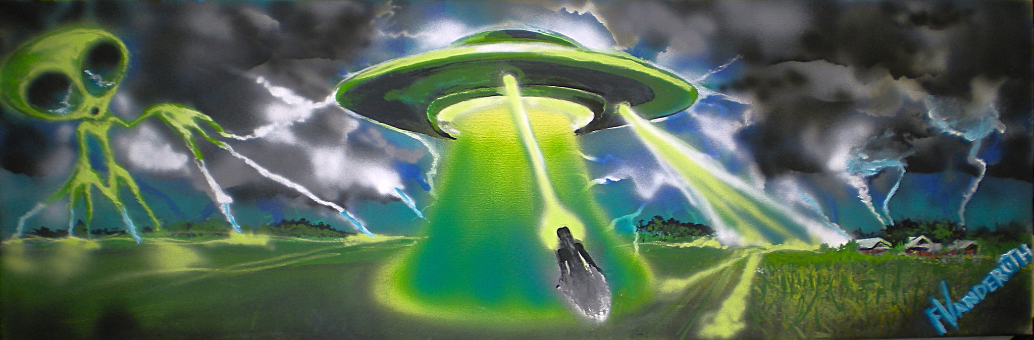 Original 12 x 36 painting on canvas. Heartland Harvest could easily have been labeled Harry's human harvest in the heartland of America. This region poses less obstacles per abductee than (let's say) the Northeast. Less populated, few mountains and fewer observers. The lack of an ocean view certainly concerns Harry and his USO {Unidentified Submerged Object) gang, but as most humans know you can't have everything. We're not in Kansas anymore Auntie Emm!